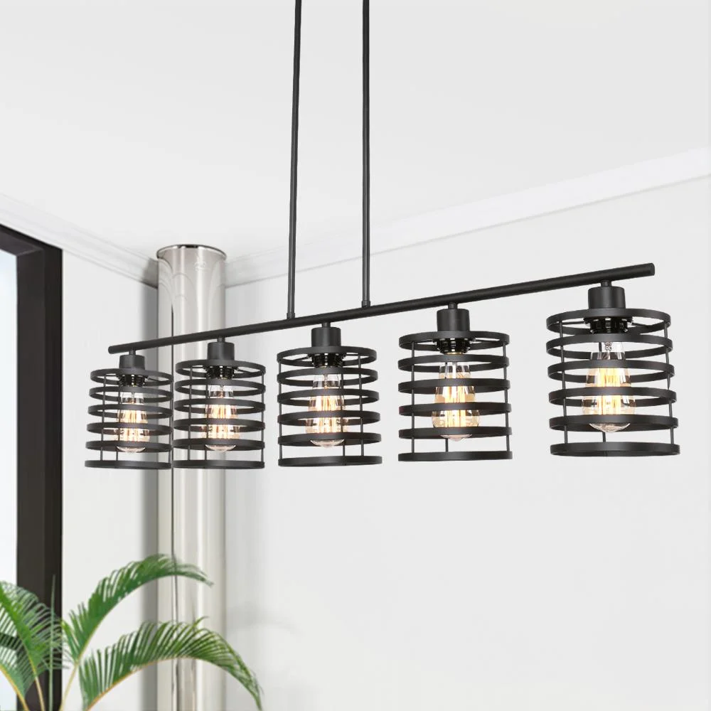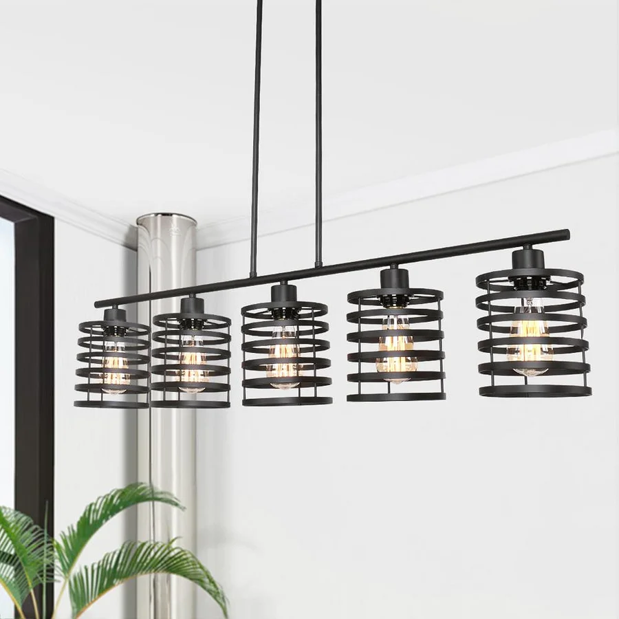 Sleek line and open-caged pendants pair together to create this farmhouse kitchen island lighting. Dressed in a black finish, this kitchen island linear pendant lighting features a horizontal support rod hanging five coil-like cylinder shades below. Compatible with E26/E27 medium-base bulbs (not included), this 5-light kitchen island pendant emits the filtering lighting through the open shades. Hang up this kitchen island linear pendant lighting over your kitchen island, long dining table, or home bar to enjoy a welcoming glow with your family and friends.Detail